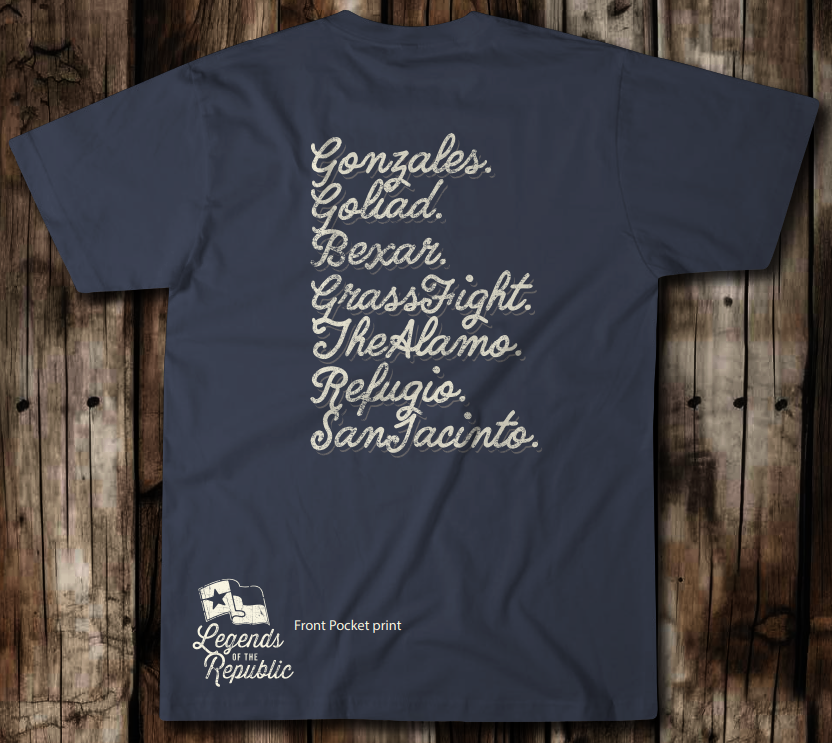 The front print is on the left pocket area with our Texas Legends series and the back print has all the battles.