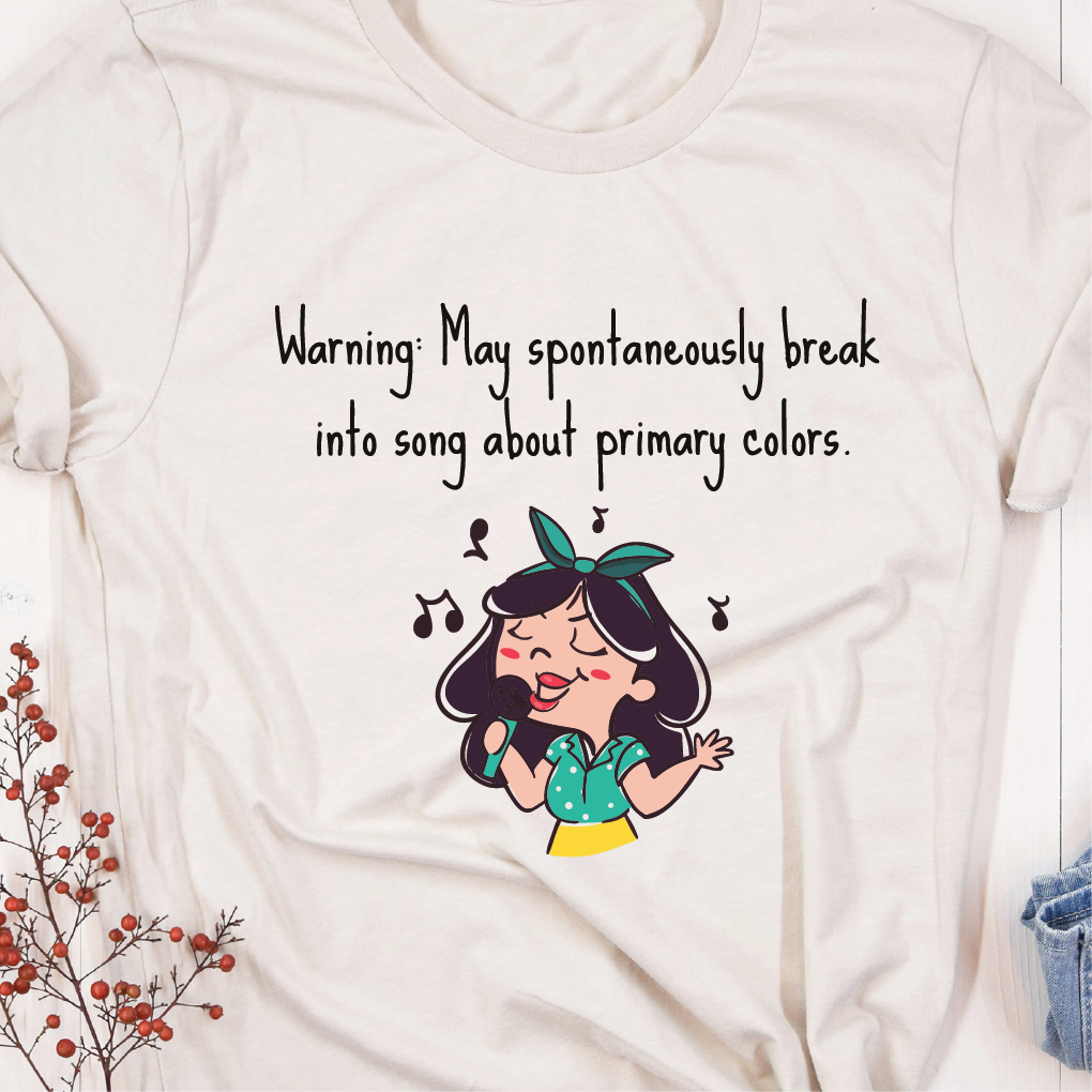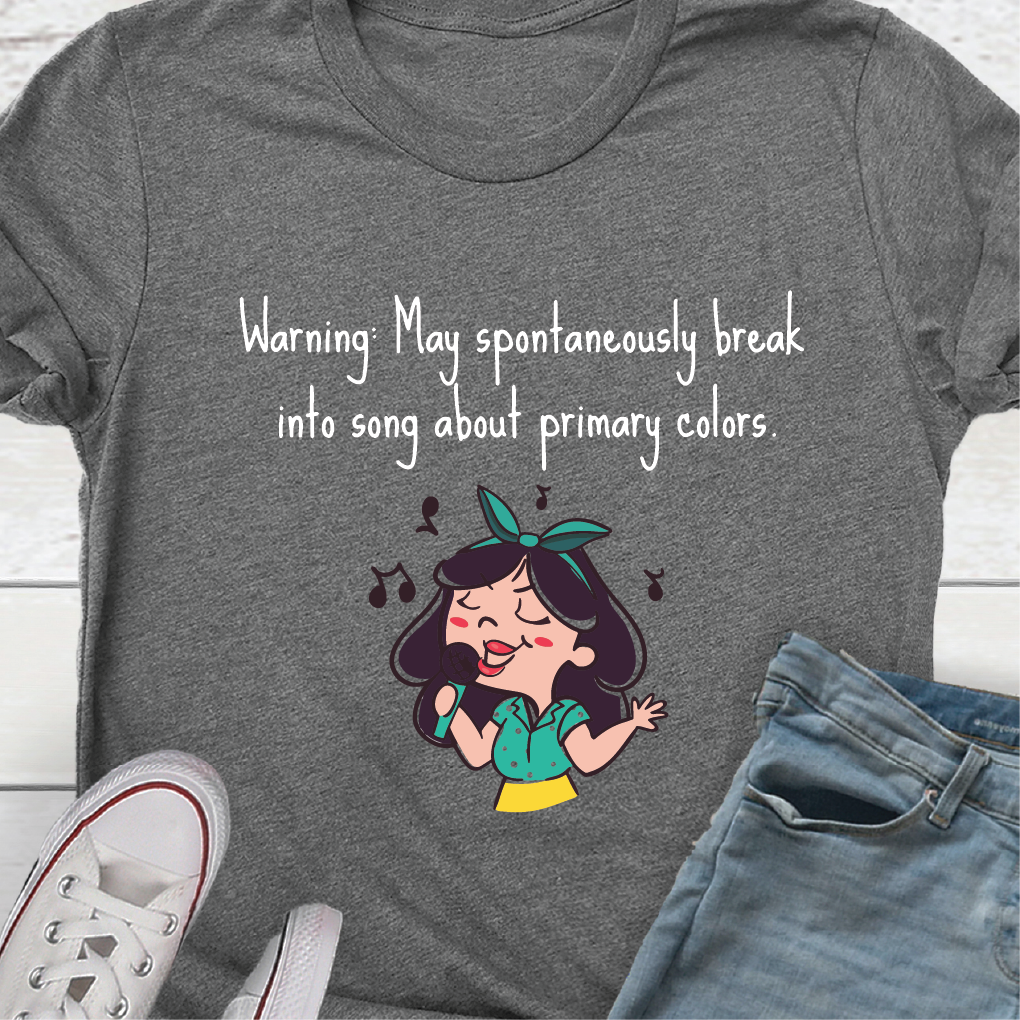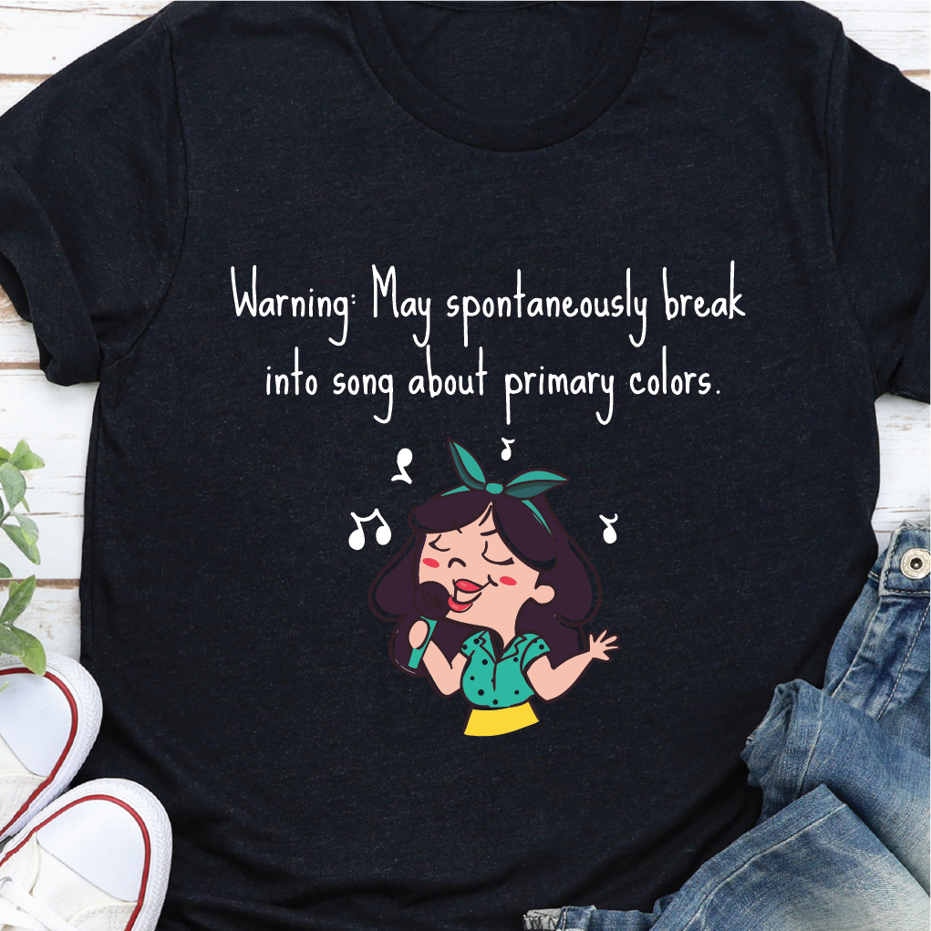 Inject some fun and color into your wardrobe with our "Warning: May Spontaneously Break into Song About Primary Colors" shirt. Perfect for artists, educators, and anyone who loves to celebrate creativity, this shirt is a great way to showcase your joyful and artistic spirit.